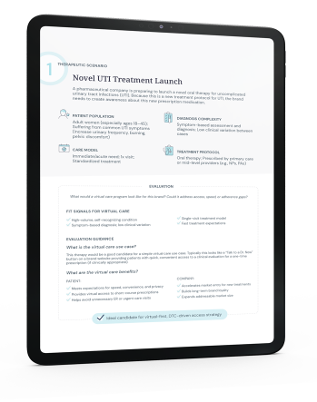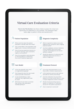 Ideal for commercialization, digital innovation, brand management, and market access leaders seeking to modernize patient engagement. Use our step-by-step framework to evaluate your brand’s commercialization strategy for virtual care and uncover when and how to launch programs that accelerate access, engagement, and ROI.